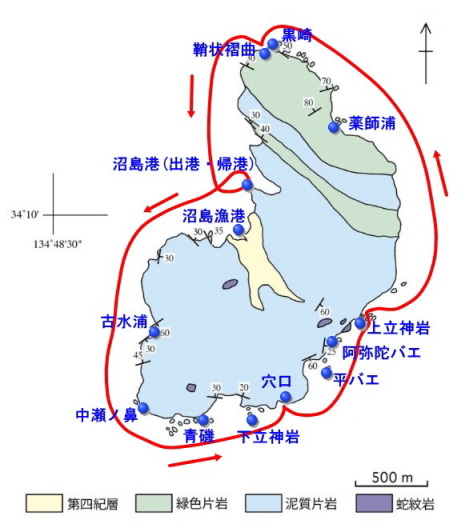 沼島おのころクルーズと「さや状褶曲」 この島の周囲を漁船でぐるりと巡る「沼島おのころクルーズ」に参加しました。国生み神話の「上立神岩」や珍しい「さや状褶曲」など見どころいっぱいの人気のクルーズです。 1.沼島の地質 沼島は三波川変成帯にあって、全島に結晶片岩が分布しています。 結晶片岩には、主に原岩のちがいによっていくつかの種類があります。その中で、沼島の北部には緑色片岩が、南部には泥質片岩が多く見られます。 緑色片岩は玄武岩質の火山岩や火山砕屑岩が変成作用を受けたもので、緑色~淡緑色をしています。 泥質片岩は泥岩が変成作用を受けたもので、黒色~灰黒色です。この色の違いによって、船からの観察でもどちらかがだいたいわかります。 その他、砂岩が変成作用を受けた砂質片岩や、チャートが変成作用を受けた石英片岩も分布しています。石英片岩の中には、紅簾石をふくんで赤い紅簾石石英片岩も見られます(厳密にいうと、Fe>Mnのため紅簾石ではなく、Mnをふくんだ緑簾石です)。 これらの結晶片岩には、真白い石英脈が片理と平行にあるいは斜交して薄層やレンズ状に入っていることがあります。 また、上立神岩の周辺には蛇紋岩が小規模に分布しています。 三波川変成帯の変成岩のもとの岩石は、白亜紀後期の付加体(四万十帯北帯にあたる)です。それが、プレートの沈み込みによって地下深くへと引きずり込まれて低温高圧型の変成作用を受けました。 沼島の変成岩からは、今から9500~8500万年前という変成年代が得られています。この年代は、沼島の蛇紋岩と泥質片岩の反応部の緑泥石に富む岩石中のモナズ石からチャイム(CHIME)法という方法によって得らました(Suzuki et al,2018)。 2.おのころクルーズ 船は沼島港から、反時計回りに島を一周します。沼島では、この回り方を女回りといいます。この反対は男回りです。男回りと女回りの名の由来は、古事記に書かれたイザナキとイザナミが国生みの始めに寝殿の聖なる御柱を回った方向からつけられたということです。 この日の船は上野宏文さん船長の宏漁丸、案内は沼島観光ガイドの小野山豪さんです。小野山さんは地質にも歴史にも神話にも詳しく、楽しい解説が途切れなく続きました。
