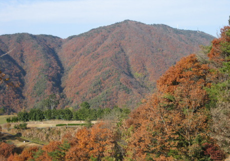 関西軽井沢ゴルフ場から大野山を見た。標高720mの肩が秋の空にそびえ、そこから電波塔を乗せた山頂まで稜線がゆるやかにつながっていた。