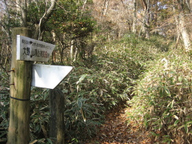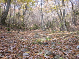 道はいつの間にか細くなり、小さな谷の上部を等高線に沿うように曲がりくねって続いていた。周囲はずっと晩秋の雑木林。道の両側に生えているコアジサイの黄色の葉が、ずっと目を楽しませてくれた。