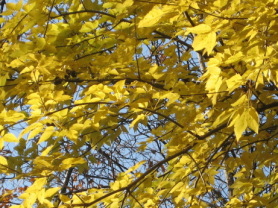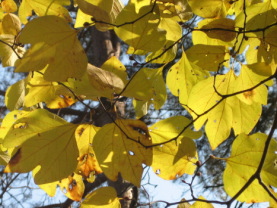 道は山腹を斜めに上り、谷は右下に少しずつ深くなってきた。褐色の木々の中に、タカノツメとダンコウバイが競い合うかのように黄葉を日に透かして輝かせていた。