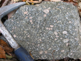 落ち葉の間から、20〜30cmぐらいの大きさの石がごろごろと顔を出していた。石は、ピンク色のカリ長石、白色の斜長石、それに石英の大きな結晶の入った花崗斑岩。たいていが風化の進んだものだったが、1つ2つ新鮮なものを見つけることができた。