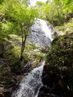 No3から少しだけ寄り道をして、不動の滝(雌滝)へ。水かさを増した滝の水は、黒い岩肌を勢いよく流れ落ちていた。