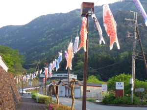 No33で明神橋を渡ると、首切地蔵。江戸時代、年貢減免の直訴に向かおうとした上月平左衛門がここで役人に切り殺された。人々は、その霊をなぐさめるためにお地蔵さんを祀ったが、すぐに首が落ちてしまった。ちょうど、平左衛門が殺された姿と同じように・・・。小さな社の中に、首の切られたお地蔵さん今も祀られていた。 すぐバス道を折れて農道に入り、その道を真っ直ぐに歩いた。 No37で太子橋を渡り、安寿庵を過ぎて、先を急いだ。 夕暮れの空に、たくさんのこいのぼりがたなびいていた。こいのぼりの下の坂道を登り、午後6時、グリーンエコー笠形にたどり着いた。 新田ふるさと村からグリーンエコー笠形まで16.2km。花を撮りながらの4時間30分の道のりであった。 2012年5月6日 「越知川名水街道」で咲く花々
