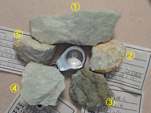 兵庫 大屋の「白いヒスイ」 (養父市) 工藤さんとは松内茂さんを介してお会いし、その後但馬の地質観察や鉱物採集に何度かご一緒させていただきました。 ヒスイ輝石の標本は、工藤さんの自宅に泊めていただいたときにもらったものです。このヒスイ輝石を見ると、やさしく面倒見のよかった工藤さんの顔や姿を思い出します。 上の写真の①と④は、ほぼ純粋なヒスイ輝石岩。②と⑤は、表面に曹長石が認められる。③は不純なヒスイ輝石岩で、曹長石・緑泥石・白雲母をふくんでいる。 ※ ヒスイという文化財保護のため、ヒジロ谷での岩石採集はもちろんヒジロ谷への入場も禁止されています。近年、ヒジロ谷で悪質な盗掘がありました。削岩機を使った大規模な岩石の破壊によってヒスイが盗掘されたのです。ヤフーオークションで大屋のヒスイが販売されていたこともわかり、養父市は警察署に相談を行っています。 1.大屋のヒスイ 「ヒスイ」は、「ヒスイ輝石」が集まってできた「ヒスイ輝石岩」の通称です。日本では、糸魚川地方のヒスイが有名で、古くから勾玉などに加工され珍重されてきました。 大屋のヒスイには、ほかの産地には見られないいくつかの特徴があります。 まずは、色が白いことです。そのため、大屋のヒスイは「白いヒスイ」と呼ばれています。ヒスイというと宝石のヒスイのように緑のものを連想しますが、本来純粋なヒスイはこのように白いのです。 従来、ヒスイの緑色はふくまれているCrに由来するとされていましたが、最近の糸魚川産のヒスイの研究では、ヒスイ輝石に混在するオンファス輝石の成分の1つであるFeに起因することがわかりました。大屋のヒスイはほぼ純粋なヒスイ輝石が集まったもので、オンファス輝石などの他の鉱物をほとんどふくんでいないので白いのです。 下の写真は、大屋のヒスイ輝石岩を割った新しい面です。この標本は、純白ではなくて、わずかに緑色かかっています。