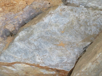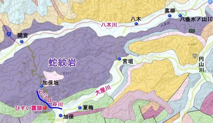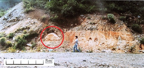 大屋のヒスイを手のひらにのせてみると、少し重い!?かな・・・と感じます。ただ、中途半端な重さで糸魚川産のヒスイのようにずっしりとした感覚はありません。 ミャンマーや糸魚川や鳥取で産出するヒスイ(隠微晶質)の比重は3.3程度。それに対して、大屋のヒスイ(結晶質)は、3.13~3.19で(「白いヒスイ谷への招待(2003)」)、ヒスイとしては少し軽いのです。(花崗岩の比重は2.7程度) 2.ヒスイ輝石岩の露頭 ヒスイ輝石岩は、ふつう蛇紋岩などの母岩中にブロックとして産出します。蛇紋岩は風化しやすいため、ヒスイ輝石岩は母岩から抜け出して転石となります。このように、ヒスイ輝石岩は転石として産出する場合がほとんどです。 大屋では、母岩に入ったままのヒスイ輝石岩の自然産状が残されています。これは、1977年に林道工事によって現れた露頭から発見されたもので、ヒスイ輝石岩の自然産状を示す発見としては日本初でした。