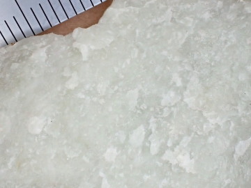 2つ目の特徴は、ヒスイ輝石の結晶が大きいことです。 ヒスイ輝石岩中のヒスイ輝石の結晶はたいへん小さく、肉眼では見えないことがふつうです(隠微晶質)。しかし、大屋のものは結晶が大きくて見えることがあります(結晶質)。 破断面に光を当てていろいろな角度から見ると、光をキラリと反射する細長い平面が見えます。これは、ヒスイ輝石の長柱状結晶の結晶面や劈開面です。 結晶の長さは5mm程度はふつうで、大きいものでは30mmを越える場合があります。劈開面には、それと垂直に交わる劈開が平行な線として観察できます。 柱状結晶の方向は、平行ではなく互いに交差していることも観察できます。また、放射状に集まっているところもあります。結晶がお互いにさし込むように組み合わさっていることが、簡単には割れないヒスイの堅牢さをつくり出しています。