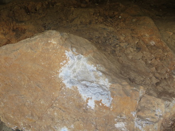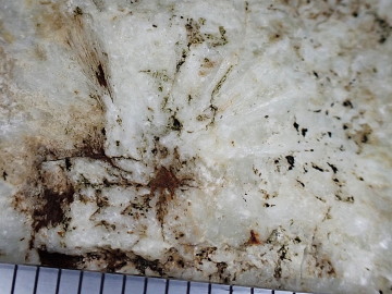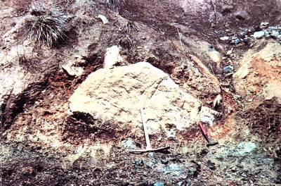 ヒスイ輝石岩をとり囲む地層は褐色の土に風化していて、格子越しに見るだけでは何から構成されているのかわかりません。『白いヒスイ谷への招待(2003)』には、発見当時の写真とスケッチが載せられています。 それによると、ヒスイ輝石岩のブロックを、曹長石・ソーダ雲母・粘土鉱物・ヒル石・角閃石・蛇紋石・かんらん岩などの鉱物や岩石がとり囲んでいます。