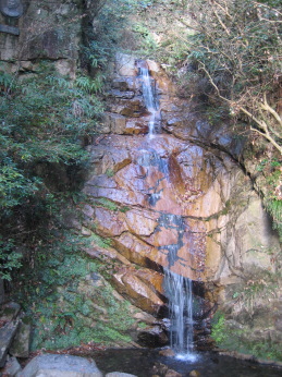 「滝の茶屋」をくぐると「大谷茶屋」。その広場の上に高座ノ滝がかかっていた。褐色に染まった花崗岩の岩肌を水が滑り落ちている。横や斜めに走る節理が、水の流れにちょっとした変化を与えていた。