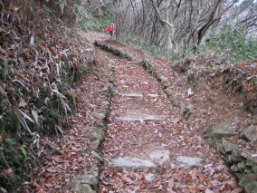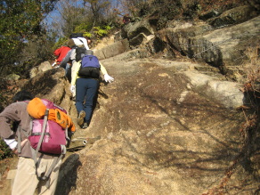 滝の左を巻き登る。風化の進んだ花崗岩の斜面に、石の階段が巧みにつけられていた。