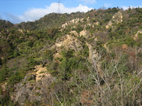 岩尾根をさらに上り、樹林帯を抜けると、見晴らしの良い岩場に出た。海側は先ほどよりぐっと大きく開け、手前に神戸や大阪の市街地が大きく広がった。地獄谷を見下ろすと、ロックガーデンの岩の風景。節理から風化の進んだ花崗岩の岩塔が、指を立てたように林立していた。かつてはクライマーの声が響き渡った、近代アルピニズム発祥の地である。