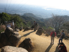 岩に登ってみた。淀川の向こうに大阪の高層ビル群がかすみ、その右に大阪湾の水が板を敷いたように平らになってまばゆく光っていた。山側に目を向けると、北東に荒地山の岩肌が近く、北西には白いホテルを乗せた六甲の稜線が長く続いていた。