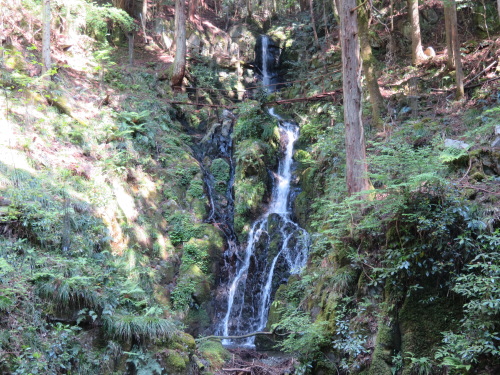 うっそうとした森に、黒い岩肌を水が細く流れ落ちている。落ち口から真下に落ちる一筋の水は、途中で何度か岩に当たって段をつくり、幾筋かに分かれたあと、下方でまた一つになる。 3段と言われているが、見ようによっては6段にも7段にも見える。滝の下方に、右から注ぎ落ちる小滝を従えて、二つの流れが合流し水量を増している。 昨日の雨で水量は豊かだった。しばらく滝を見上げていると、森の中に木漏れ日が射し込んできた。流れ落ちる水に光が当たると、絹のように白く輝いた。