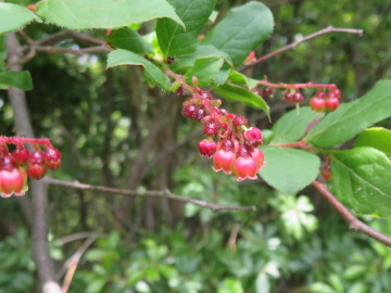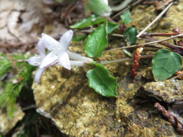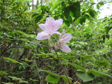 三角点から下って登り返す。このあたりは切り開きがあって歩きやすかった。 登り詰めた573mピークは、今日の最高所。切り立った岩の上に、アカマツやネジキやリョウブが根を下ろしていた。 573mピークから、神河町と市川町の境界尾根を進んだ。もう切り開きはなくなって、尾根はヤブにおおわれていた。尾根の南側に、道らしきものが残っていたがそれも途絶えがちだった。サルトリイバラのトゲが行く手をのじゃまをした。 コルを過ぎてまた登っていくと、鉄塔の下に出た。ちょうどお昼の時間。ここで昼食にしようとザックを開けたが、コンビニで買ったおにぎりが入っていない。うっ、車に置いてきた・・・。このショックは大きかった。 気持ちを立て直せないまま、再びヤブにもぐりこんだ。 よけいに厳しい尾根歩きとなった。倒木の上に、リスが食べ残した松ぼっくりの芯「森の海老フライ」がひとつ。モチツツジが、やわらかなピンクの花を2つだけ残していた。こんなものが少しだけ気持ちを慰めてくれた。 小さなピークで境界尾根から分かれて東に進むと、馬船丸山の山頂に達した。ソヨゴの林の下で、三角点(515.5m)は土や落ち葉になかばうずもれていた。サルトリイバラの実が、ほんの少しオレンジ色に色づき始めていた。