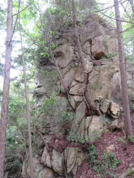| 山頂の岩石 猿岩・馬船丸山 白亜紀後期 大河内層 溶結火山礫凝灰岩 御所山 白亜紀後期 大河内層 流紋岩 401.7m三角点 白亜紀後期 花崗閃緑岩 |