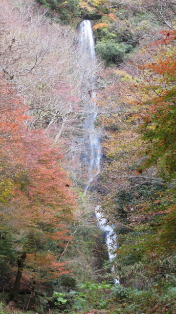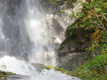道は下段の滝に行く道と上段の滝に行く道とに分かれています。まずは、下段の滝へ向かいました。 下段の滝は、一筋の水がなめらかな岩肌の溝を一気に流れ下っています。水は、三角形の形をした滝つぼに勢いよく落ちて、白い水しぶきを上げていました。滝のこの姿・・・猿のしっぽに似てるかな?