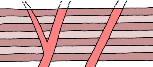 上段の滝に向かう遊歩道では、やや細粒の閃緑岩が見られました。風化が進んでいるので、はっきりとはわかりませんが、ひん岩と閃緑岩の中間型の岩石のように見えます。 ひん岩と閃緑岩は同じ岩体の岩石だと考えられます。貫入したマグマが周縁部で速く冷え固まるとひん岩になり、中心部でゆっくりと冷え固まると閃緑岩になったと考えられるのです。ただ、このような説明も岩相のちがいを岩体の分布や形と合わせて考えないといけないので、さらなる検討が必要なのかもしれません。 3.猿尾滝の岩体はラコリス 猿尾滝の岩体は、かつては岩脈と考えられていました。それが、2017年に出た論文、羽地ほか(2017)によって岩脈ではなくてラコリスであることがわかりました。 マグマが地層や岩石中に入りこむことを貫入といい、貫入して固まったものを貫入岩体といいます。貫入岩体は、その貫入のしかたや形態によって分類されています。代表的な貫入岩体に岩脈(dyke)、岩床(sheet・sill)、ラコリス(lacolith)があります。 岩脈は、マグマがまわりの岩石や地層を切って貫入し板状になった岩体です。 岩床は、マグマが地層面にほぼ平行に貫入し板状になった岩体です。 ラコリスは、水平に近い地層の間にほぼ地層面に沿って貫入し、上の地層を押し上げて「そなえ餅」のような形になった岩体です。