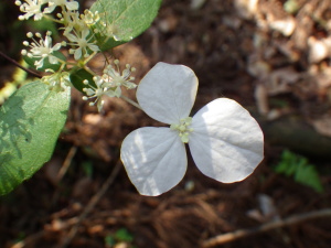 障子岩を擁してそびえる障子場へ ※障子岩の岩石については、「神河町の障子岩」をご覧下さい。 神河町大山の東方に、「障子場(しょうじば)」と呼ばれている山がる。山名は、この山が擁する「障子岩」からつけられた。 初夏の陽射しに、アカバナユウゲショウが咲いていた。七宝寺の脇を抜けて山道に入ると、小さな谷川が流れていて、ひんやりとした空気に包まれた。 シカ柵を開けて、すぐ右手の山道に入った。いきなり始まる急坂をつづらに登る。コガクウツギが、薄い木漏れ日に白いガク片を浮かび上がらせていた。