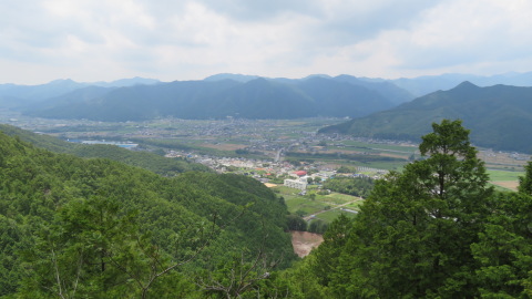 そこからピークを一つ越すと、眺望の開けた岩の上に出た。眼下に市川や越知川の流れがつくった沖積平野が広がり、家々の間を道路が縦に横に貫いている。