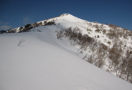 何とかスキーをはいたまま、小鉢の山頂に上ることができた。山頂のケルンは、風で雪が飛ばされて、積まれた石が見えていた。しかし今、風はなく、空は相変らず青い。ここからも、氷ノ山が美しかった。