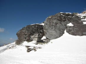 山頂のすぐ下に、数個の大きな岩が飛び出していた。岩石は、安山岩。風化によって表面が丸くなっている。板状節理が発達して、岩の下には、平たく割れた岩のかけらがたくさん落ちていた。岩の間には、石の祠が一基まつられていた。