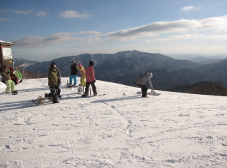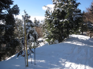 スキーをはずして、展望台に上がってみた。南西に氷ノ山が朝陽に白く輝いている。そこから右へ、1000mを越す稜線がぐるりと続き、西には高坪山の樹林の先に、小鉢と鉢伏山が白い峰を並べていた。