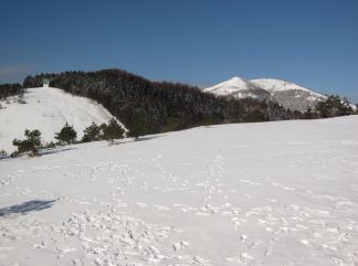 眼下に、ハチ高原スキー場やロッジ群が広がり、ゲレンデから音楽やアナウンスが聞こえてきた。好天の日曜日、スキー場は多くの人たちで賑わっている。しかし、除雪車も入らないこの峠は、雪に深く閉ざされて、野生の動物と登山者だけの世界であった。