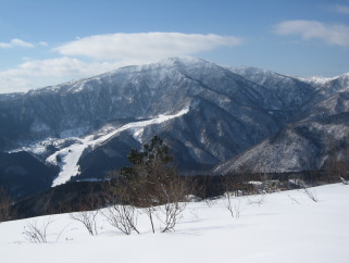 ここからしばらくは、左手に氷ノ山を見ながら進んだ。雪面に出た潅木の細い幹や枝にぶつかりながら、ボーゲンでずりずりと下ると、瀞川・氷ノ山林道の横切る峠に達した。