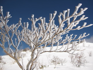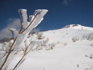 雪の中から、背の低いリョウブがぽつんぽつんと出ていた。枝についた霧氷は、この日北東方向に成長していた。霧氷の幅は2cmほど、枝の近くは透きとおっていて、手に持ってひねるとパキンと音をたてて枝から離れた。