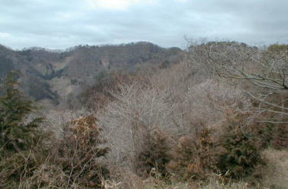 鷹取山を越すと、ほとんど水平に続く尾根が北西に見えた。尾根の北の高みが棚原山頂上で、そこにはまばらに生える木々の下に黄土色の土がのぞいていた。