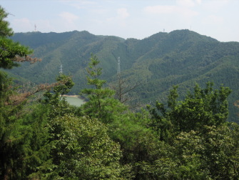 三角点から一段低いところにアンテナが立っていた。ここから南東に、日光寺山と深山が近く、その下に池が緑色の湖面をたたえていた。山頂から尾根を北へ進み、226mピークから北西へ折れて盛林寺へ下りた。