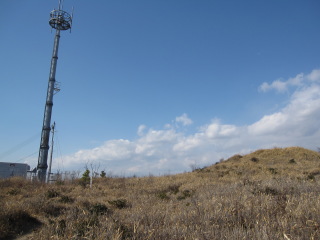 あたりは、枯れたササの広がる原っぱだった。「魚崎構居跡」の白い杭と1本の高いアンテナが立っている。ササ原の中の丸くて小高い丘が竜山の山頂だった。