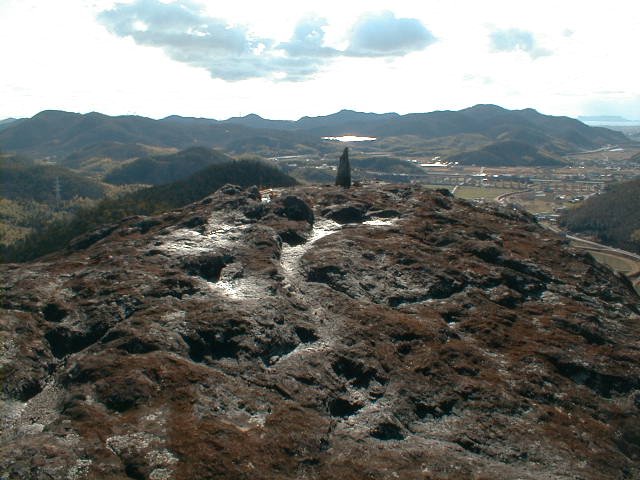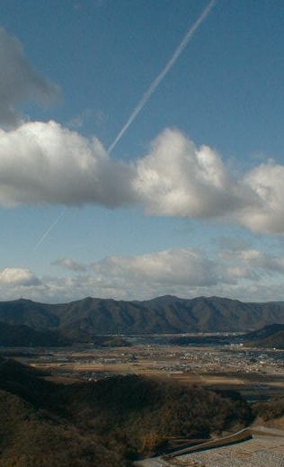 山頂の横に突き出た岩があり、その上に立つと西への展望が開ける。正面には、揖保川の後ろに的場山・大蔵山・亀山(きのやま)などの山塊が低く山稜を伸ばしている。南には瀬戸内海が光り、家島の島々が浮かんでいる。その手前には、そこからこの山を見初めた山陽自動車道が走っている。北風が緩く吹いているが、そう冷たくない。上を見上げれば、積雲はやや速く流れている。その積雲のずっと上、飛行機雲が幾本か東西に白く伸びていた。