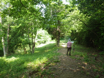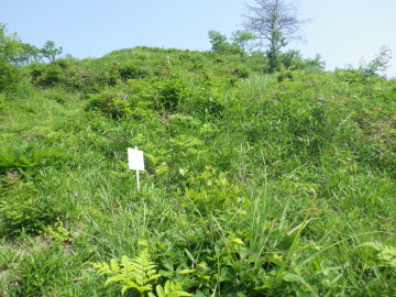 帰りは、三の郭の西の「犬走り」を通った。この斜面にも畝状竪掘が掘られていた。犬走りは、この畝状竪掘を横切っているので、くねくねと湾曲していた。 曲輪を囲む横堀、斜面に配した畝状竪堀、横矢掛りや虎口や土塁・・・敵の攻撃から城を守るためのいろいろな工夫が地形として残されていた。 説明板を読みながら進んでいくほどに、守りに徹したこの城の高度な縄張りに目を見張った。 テリハノイバラの白い花の上を、コミスジが涼しげに飛んで行った。