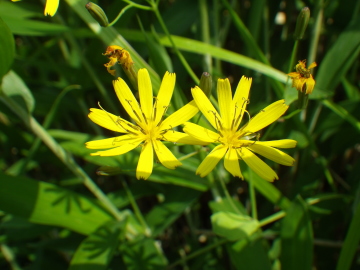 道端の日当たりの良いところにニガナが咲き、クチナシグサが白くて可愛い花を付けていた。