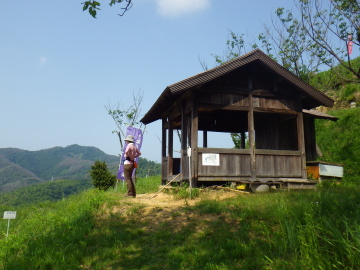 道はよく整備されていて、大きく曲がるところには道標がつけられていたり、急なところには丸太が渡されていたりしていた。雑木の落葉と、ヒノキの丸い実を踏みながら、山道を登っていった。 登り始めて10分あまりで、頭上の枝葉が途切れ城跡の南端に達した。ここには、ふもとからもよく見えるお堂が建っていた。お堂には、恒屋城を築いたとされる(播磨鑑 1762)恒屋伊賀守光氏が祀られていた。 お堂は南に視界が開け、眼下に恒屋の集落が広がっていた。手前の草地に、「畝状竪堀」のプレートが立っていた。竪堀を連続して並べ、敵が攻め上りにくくしていたのである。横からこの斜面を見ると、地表がゆるくうねっているのがわかった。