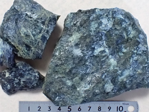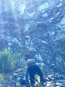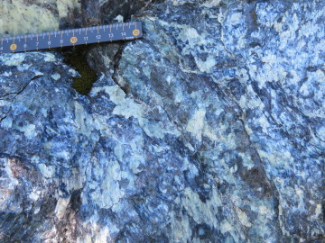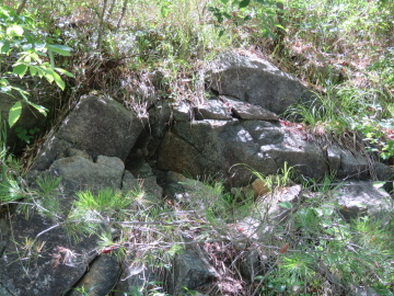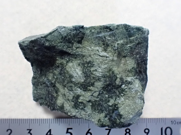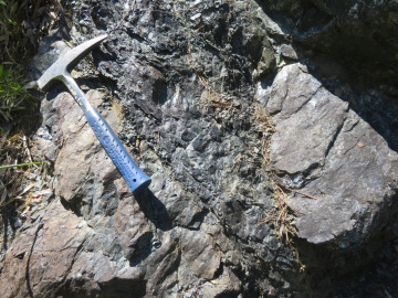 この露頭の下の方には、黒くて塊状の蛇紋岩が見られます。ハンマーで割った面を観察すると、アンチゴライトと思われる暗緑色で柱状の結晶が束状に集まっているのが見えました。