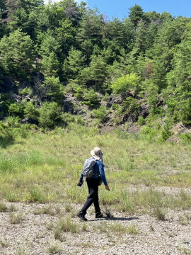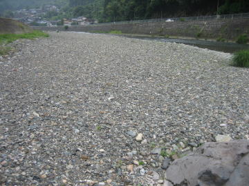 まずは、伊豆橋上流の川原です。ここには、小石の川原が大きく広がっています。橋の脇から川原に下りて、上流から流れてきた蛇紋岩の小石をひろいます。この小石は、いろいろなところで話をするときに「ひょうごの小石の標本」の1つとしてプレゼントしています。 ここでは蛇紋岩のほかに、角閃岩・結晶片岩・花崗岩・安山岩・流紋岩・砂岩・泥岩・凝灰岩などを見ることができます。 猛暑の川原は、もうほんとうに暑くて1時間いるのが限界でした。