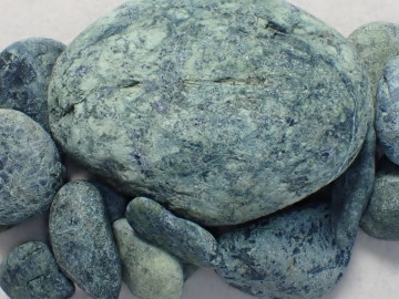 蛇紋岩露頭③では、脂肪光沢のあるすべすべした触感の蛇紋岩が見られます。滑りやすく、ハンマーでたたくと葉片状にうすくはがれるように割れます。割れた面を見ると、こすれあった跡が筋となって残っています。 表面の色は、青・緑・黒があって、そこに白や黄色が混ざってまだら模様をつくっています。 複数の種類の蛇紋石や緑泥石からなっていると思われます。また、磁石が強く引きつけられるので、磁鉄鉱をふくんでいることがわかります。