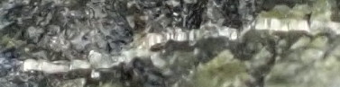 蛇紋岩露頭②は、大きく節理が入っていますが薄くはがれるように割れる性質はなく塊状の蛇紋岩です。ハンマーでたたくと硬くてなかなか割れませんが、岩石自体はどの部分もカッターナイフの刃で簡単に傷がつくやわらかい鉱物でできています。 採集した標本(写真右)には黄緑色の部分と濃緑色の部分があります。蛇紋岩は蛇紋石が集まってできた岩石ですが、蛇紋石にはクリソタイル、リザード石、アンチゴライトの3種類があります。 この中で、黄緑色の部分は主にリザード石でできています。ルーペで観察すると、黄緑色の微小結晶が集合したリザード石が観察できます。濃緑色の部分は塊状で、リザード石のほかにクリソタイル、アンチゴライト、緑泥石などをふくんでいると思われます。 この標本には絹糸光沢をもった繊維状のクリソタイルの細い脈が入っています(写真下)。 標本のどの部分にもひもに下げた磁石が強く引きつけられるので、磁鉄鉱をふくんでいることがわかります。