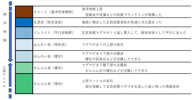 オフィオライトとは、付加した過去の海洋プレートで、上部マントルのかんらん岩類や海洋地殻のはんれい岩、玄武岩、チャートから成っています。 下の図は、オフィオライトの層序図です。この図のいちばん下の「かんらん岩(塊状)」が蛇紋岩なったもとの岩石と考えられます。その上の「はんれい岩(等粒状・層状)」は、その「かんらん岩(塊状)」が部分溶融することによって生まれました。