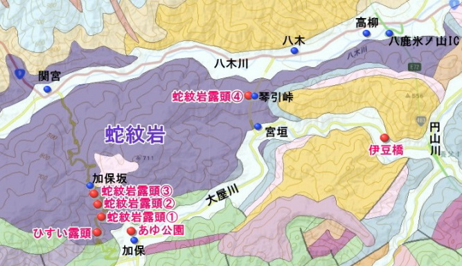 日本最古のオフィオライト、養父市の蛇紋岩 兵庫県には、この蛇紋岩が養父市(関宮岩体)と豊岡市(出石岩体)に分布しています。今回、養父市の加保坂や琴引峠周辺で、蛇紋岩を観察しました。 1.関宮岩体の蛇紋岩 今回は、上月さんと二人での地質観察です。最近は毎月のように二人で石や地層を見るためにどこかに出かけています。 伊豆橋、あゆ公園、ひすい露頭と巡り、そのあと蛇紋岩の露頭4ヵ所(①~④)を訪れました。