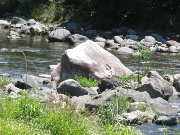 次は、あゆ公園です。公園は、ひすい輝石が発見されたヒジロ谷川が大屋川に注ぐ地点にあります。 大屋川の流れの中に真白い岩をいくつか見ることができます。これは、ほぼ曹長石だけからなる曹長岩です。あたりには黒っぽい岩が大いので、曹長岩の白はとてもよく目立ちます。 ここでも小石を拾うことができますが、暑いので省略です。