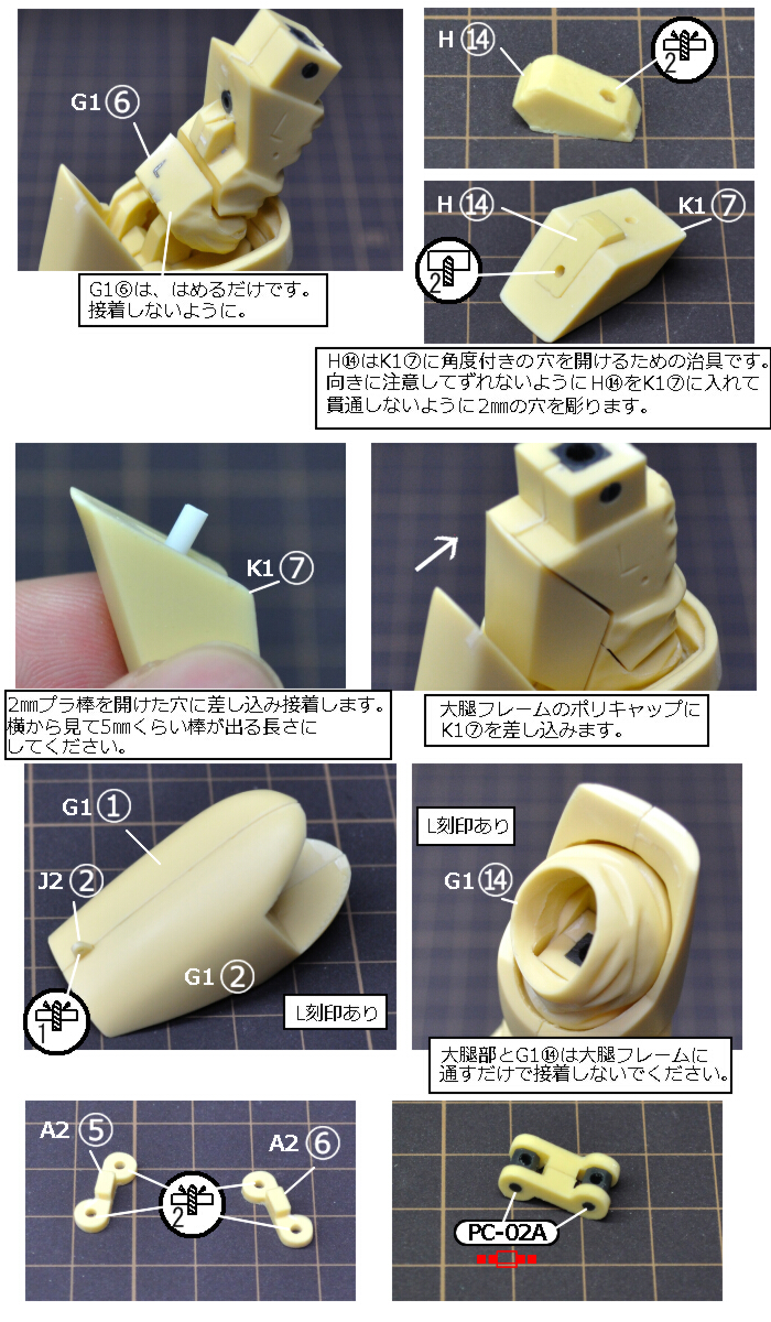| 接着するときに可動部に接着剤が流れないように注意してください。 必ず仮組をしてパーツのすり合わせや調整をしてください。 仮組をすることで構成を把握することが出来るので塗装時の順序など 計画が立てられるように成ります。 |