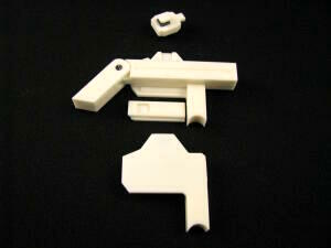 | さて硬化したレジンパーツです。 可動アームはポリランナーで動きます。 軸の部分には出っ張りが付くので 塗装を考慮して別パーツにし軸を隠します。 |