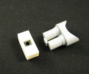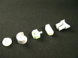 | 腰部の基部です。股関節を固定させるので かっちりと作ります。 胴体を可動させる「関節技」と それをスライドさせるポリキャップを挟み込み 接着します。胴体側がL字に成っているのは 腹部をスライドさせるためです。 |