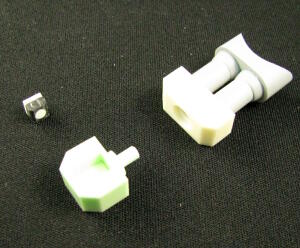 | ヒジ関節の基部にポリキャップを入れて スライド出来るようになります。 軸をヒジの円柱パーツに接着します。 |