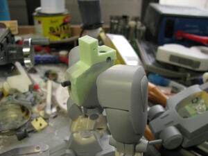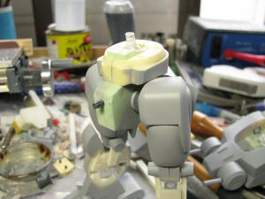 | ヒジ関節はポリキャップを押し込み、左右から軸を差し込み前腕ぶへ上からスライドさせて 接着します。ザカールやスカルガンナーでやった方法です。 |