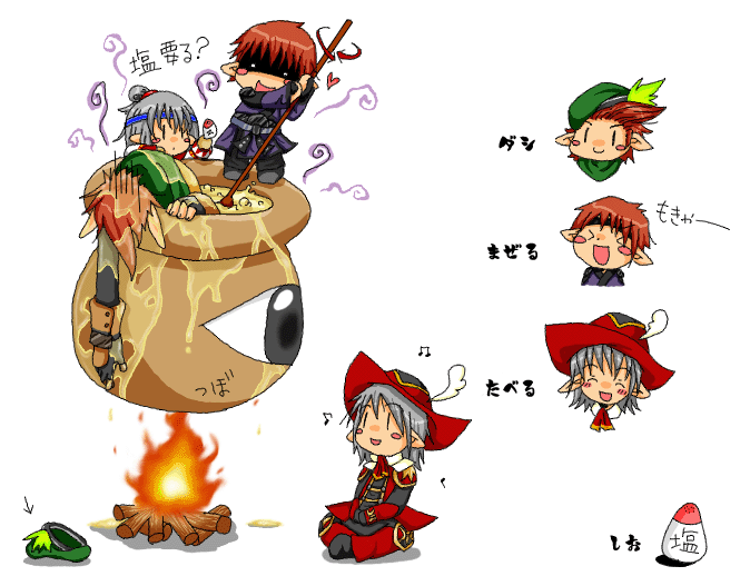 珍しく意味もなく大きめのイラストです。当時管理人が所属していたLSのメンバーを描いたもの。 (まぜているタルタルのお方と大喧嘩したので離脱しました。) さりげなく自分もまざってます。塩持ってる灰色の髪のキャラです。