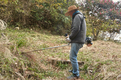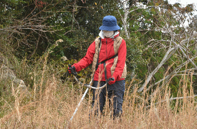 | 第一郭は毎回お願いしているY村さんに担当して頂きました。前回の作業で大分刈って頂いていたので,今回は刈り残し部分と周辺部の草を丁寧に刈ってくださいました。 |