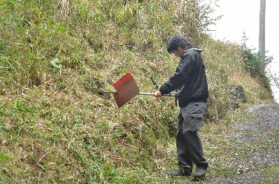 | 作業終盤には若者二名も駆けつけ難しい法面などをやってくれました。さすがにこの手の作業のプロのK大くんとY太くん。法面も上手に刈ってくれ,周囲がすっかりきれいになりました。この日は寒さが心配されたのですが,意外に暖かく全員汗をかきながらの作業となりました。11時45分には作業終了。予定していた草刈りはほぼ完了しました。 近くのうどん屋「多吉」に移動して昼食。一年のご苦労に報いるためにささやかな慰労会です。 |